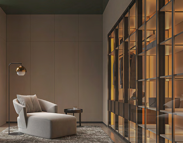 柜內線燈位于立柱槽口向內照射,不刺眼,且光線不會被懸掛的衣物等收納物品遮擋,方便物品的取用。