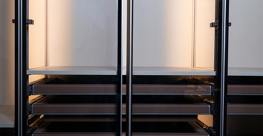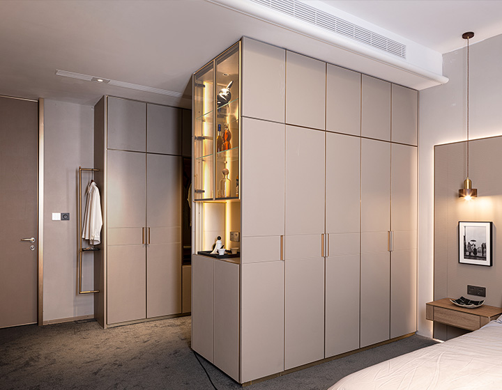 柜內(nèi)線燈位于立柱槽口向內(nèi)照射,不刺眼,且光線不會被懸掛的衣物等收納物品遮擋,方便物品的取用。